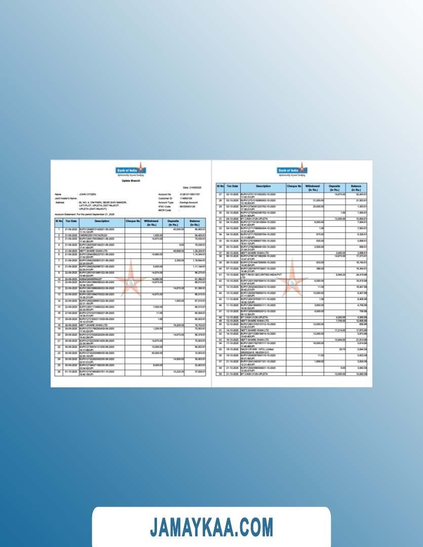 India Bank of India account statement Word and PDF template, 2 pages