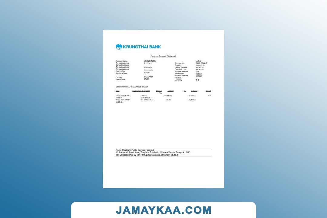 Thailand Krungthai bank statement Word and PDF template