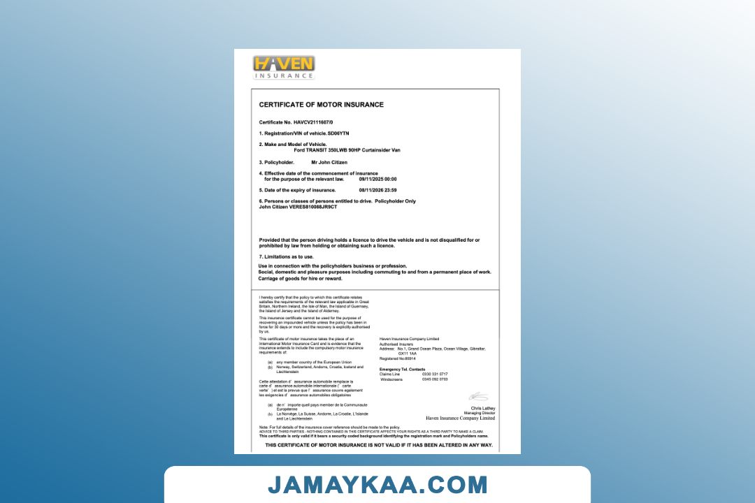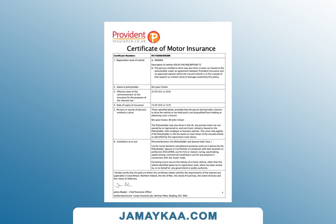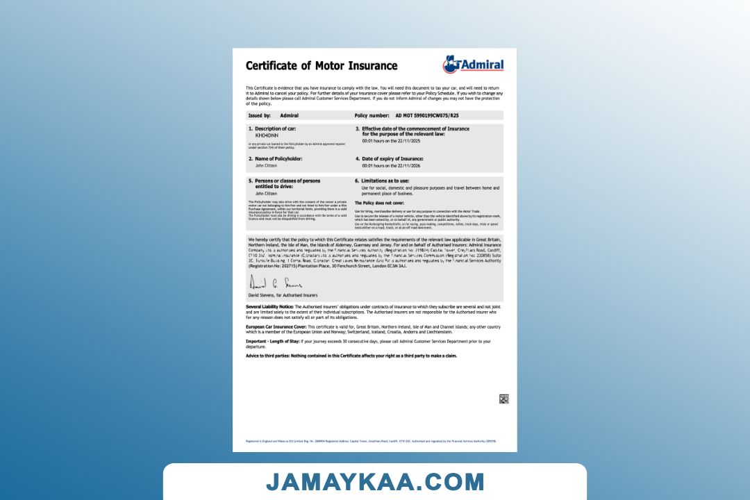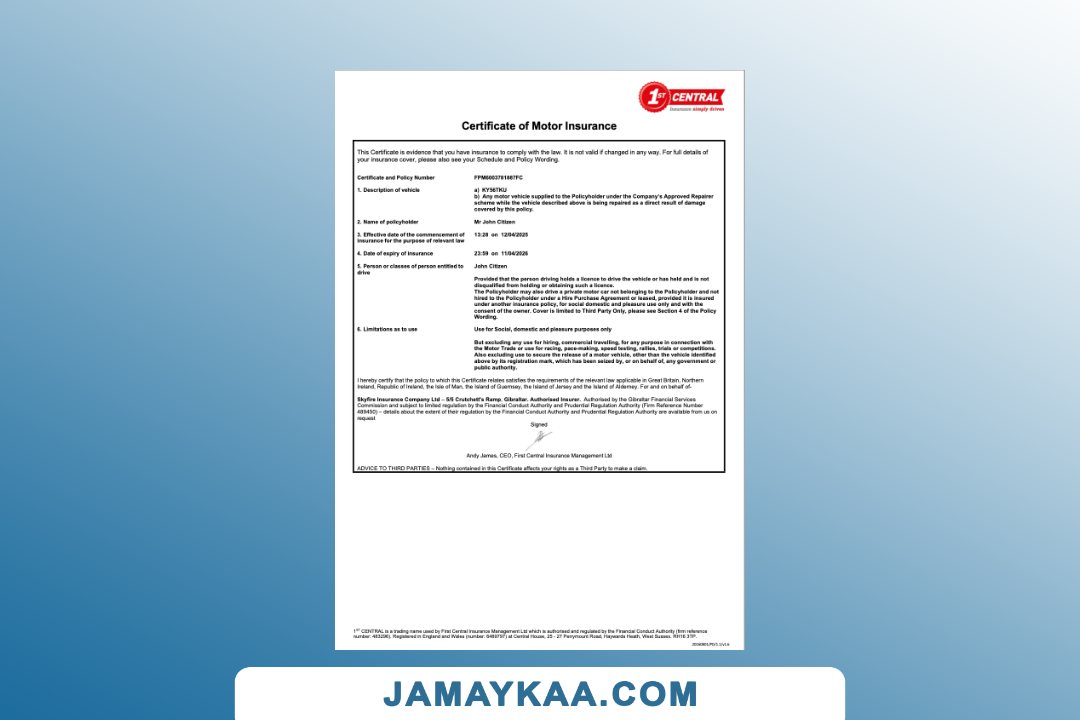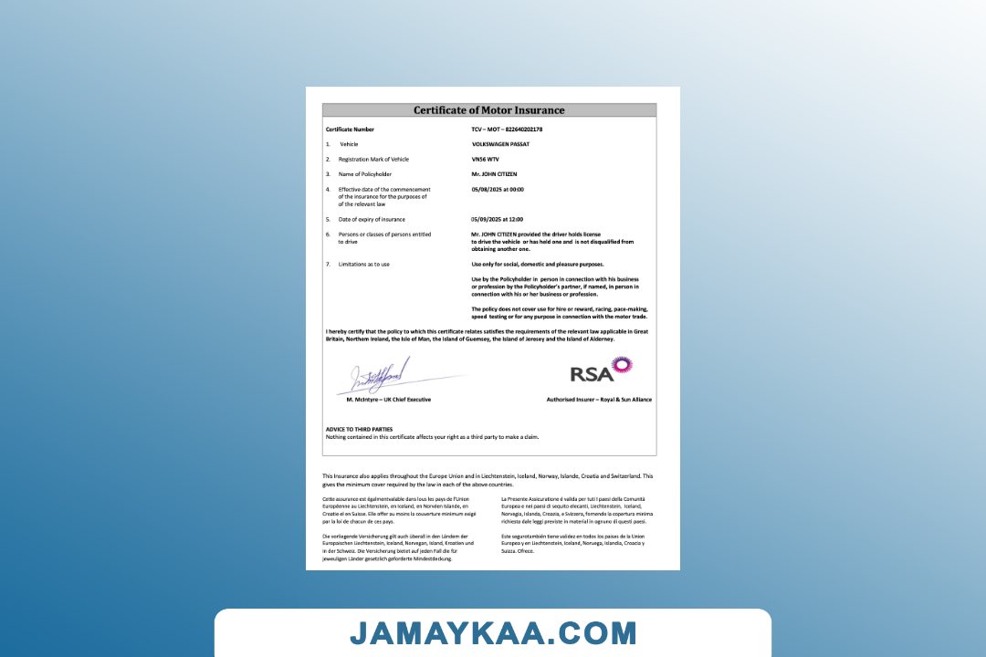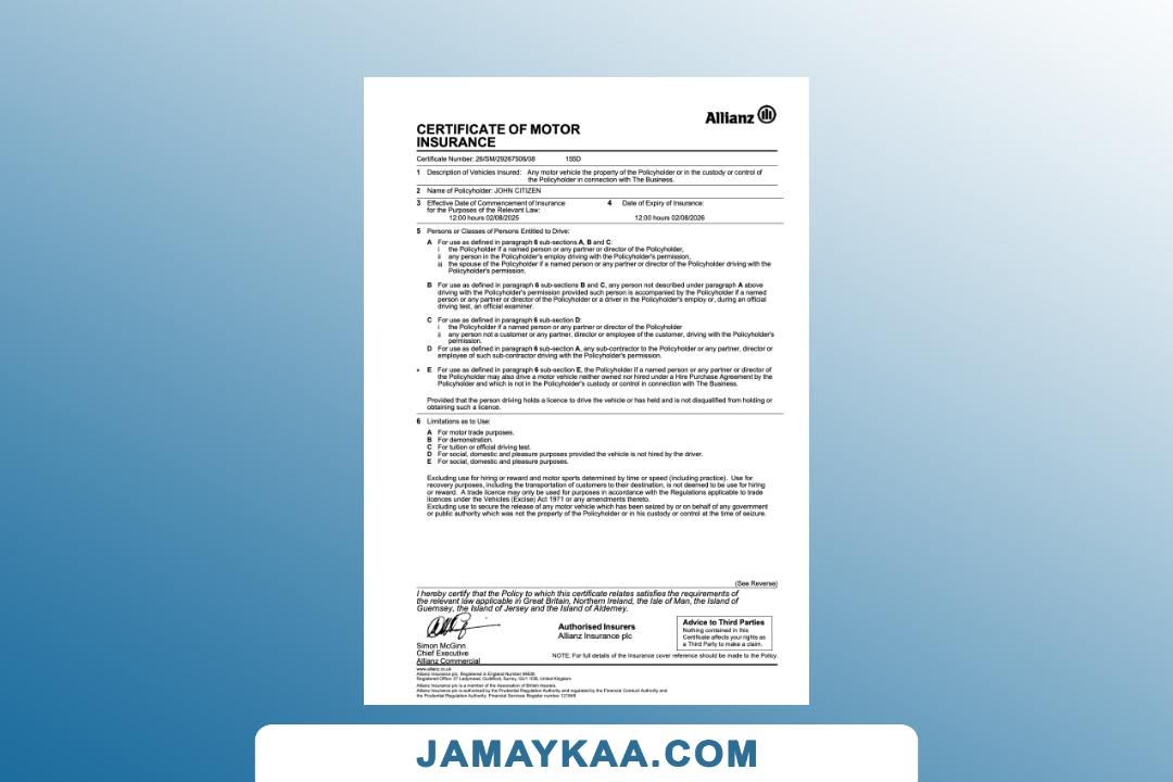 Insurance Company Europe Limited certificate of motor insurance Word and