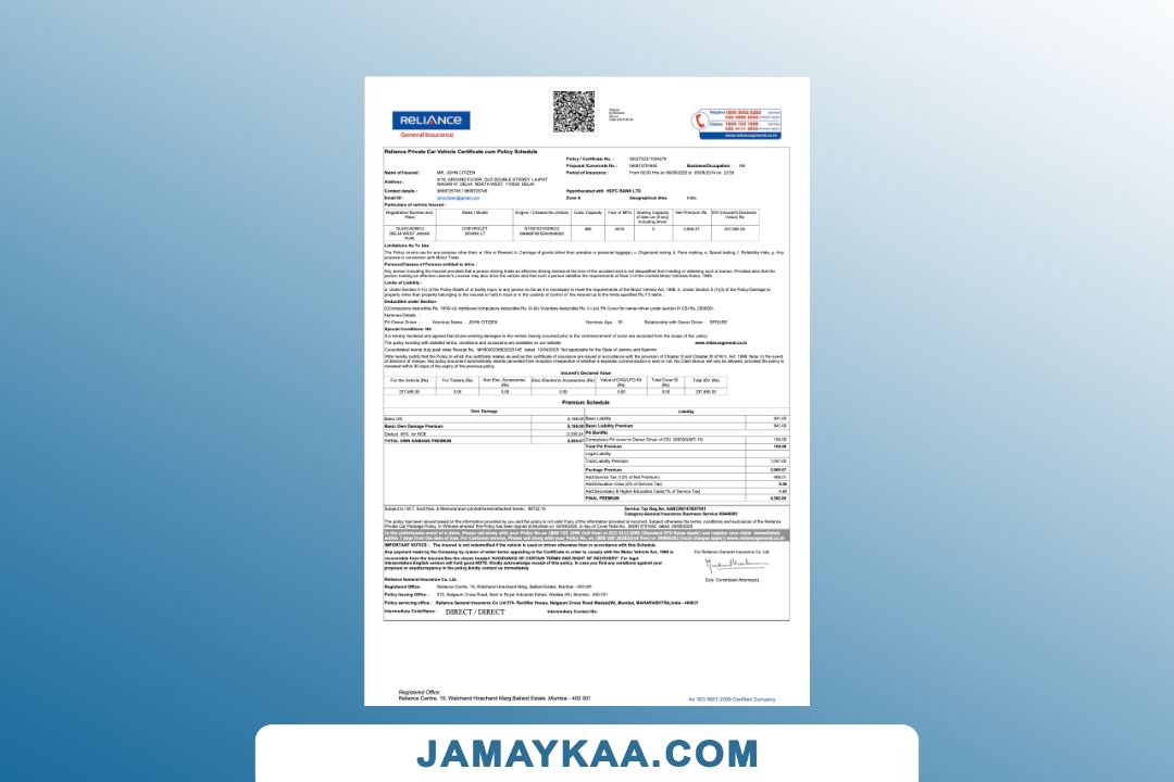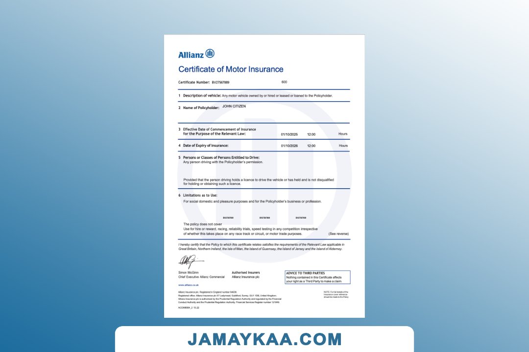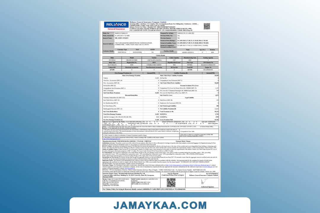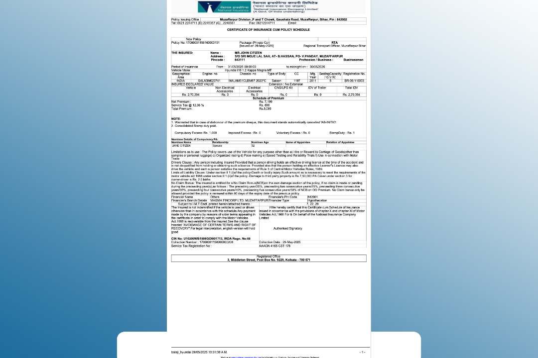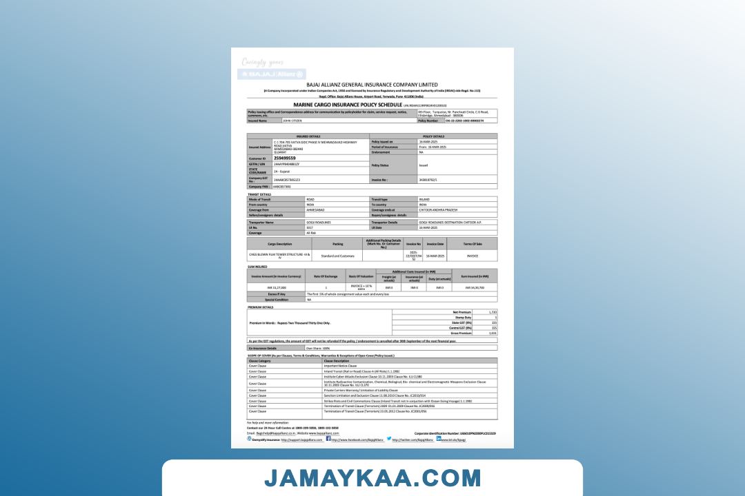 Bajaj Allianz General Insurance certificate of insurance cum policy