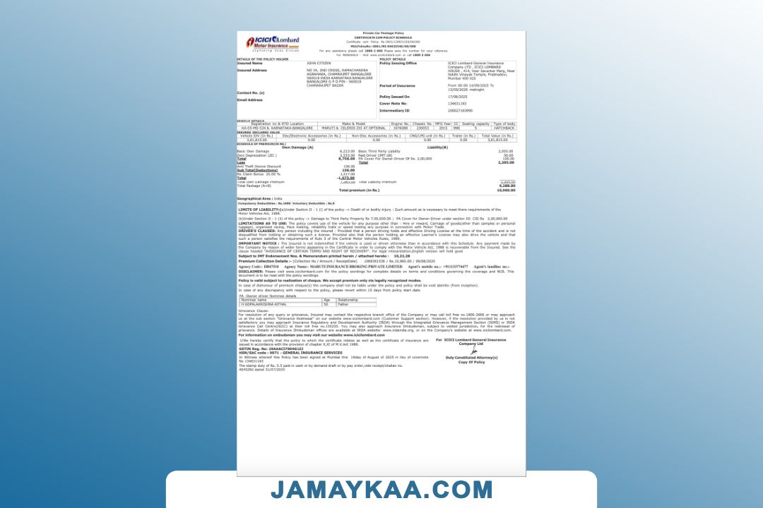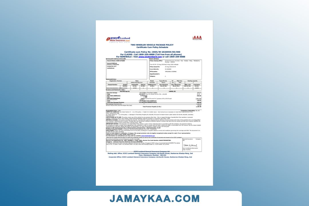 ICICI Lombard General Insurance Company certificate of insurance cum