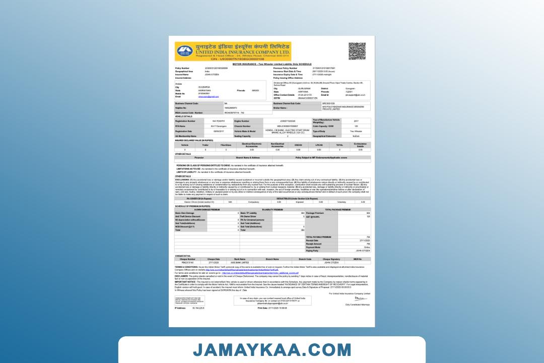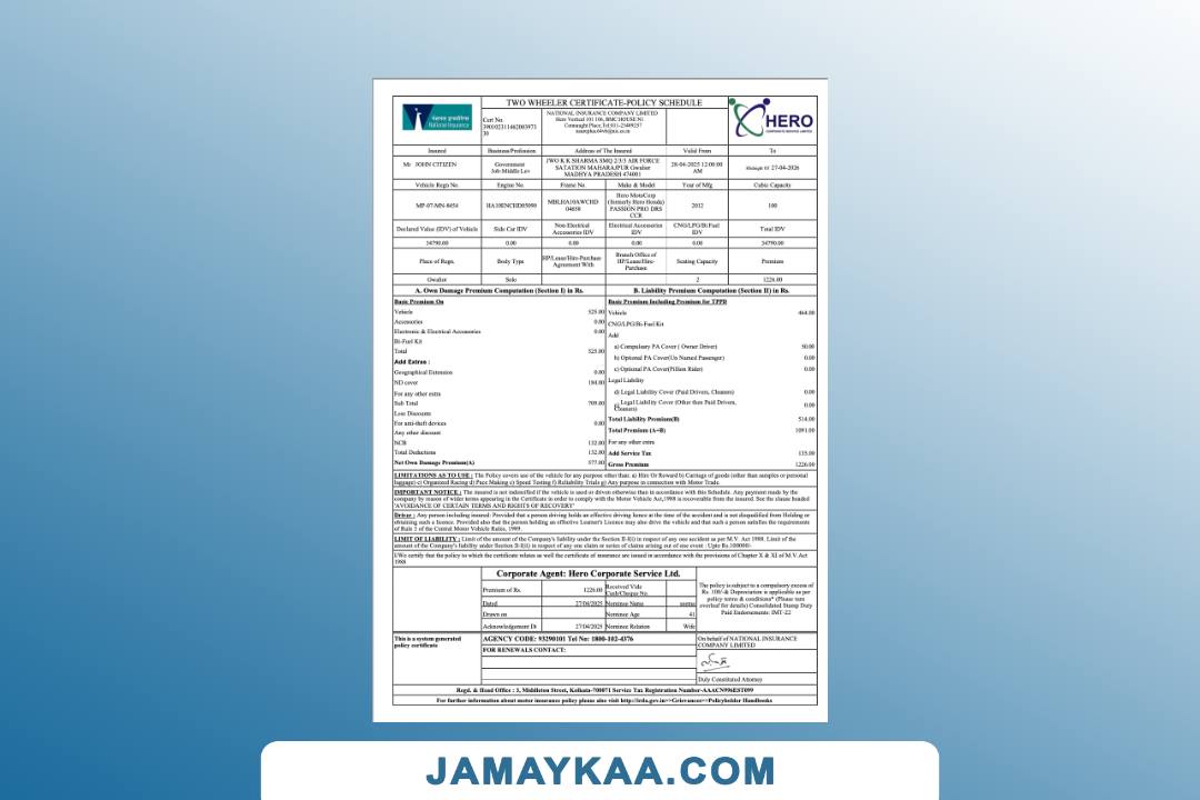 National Insurance two wheeler package policy certificate cum policy