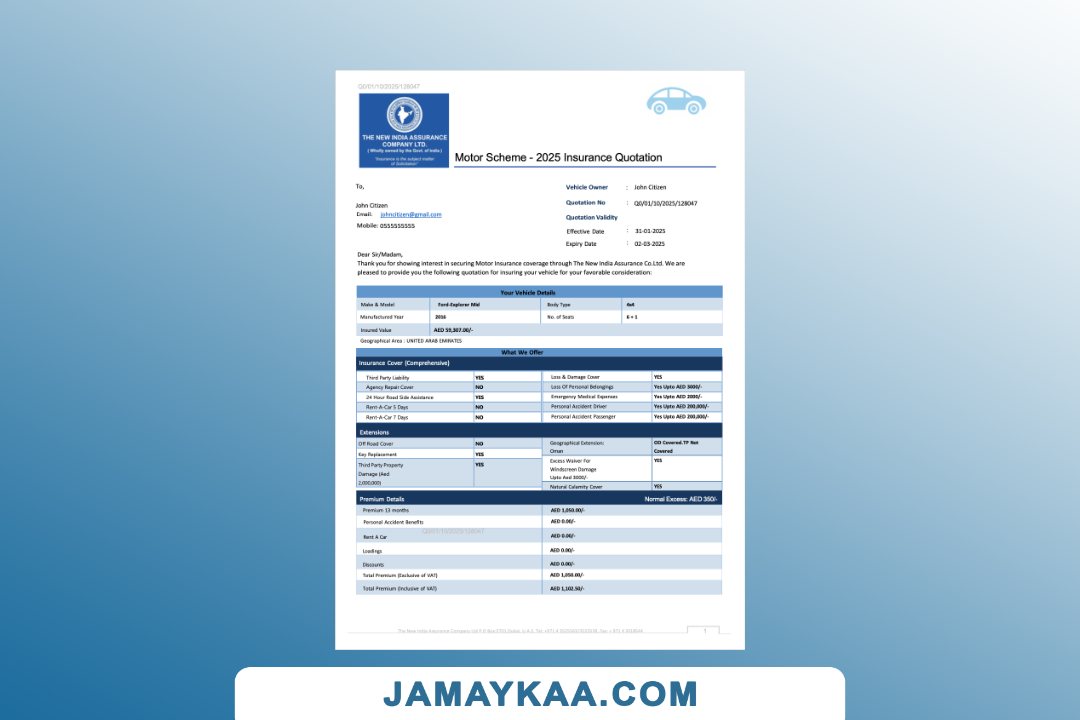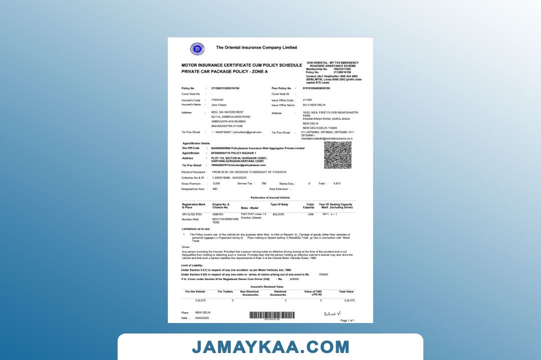 The Oriental Insurance Company motor insurance certificate cum policy