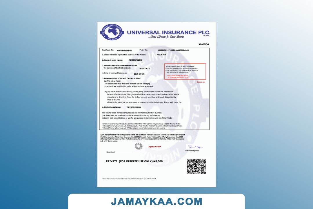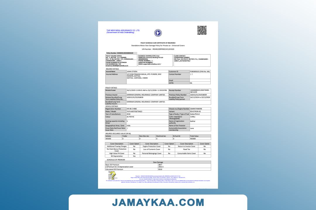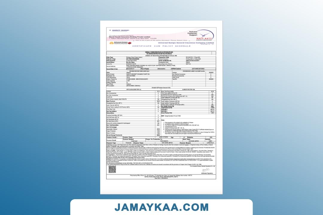 Universal Sompo General Insurance certificate cum insurance policy