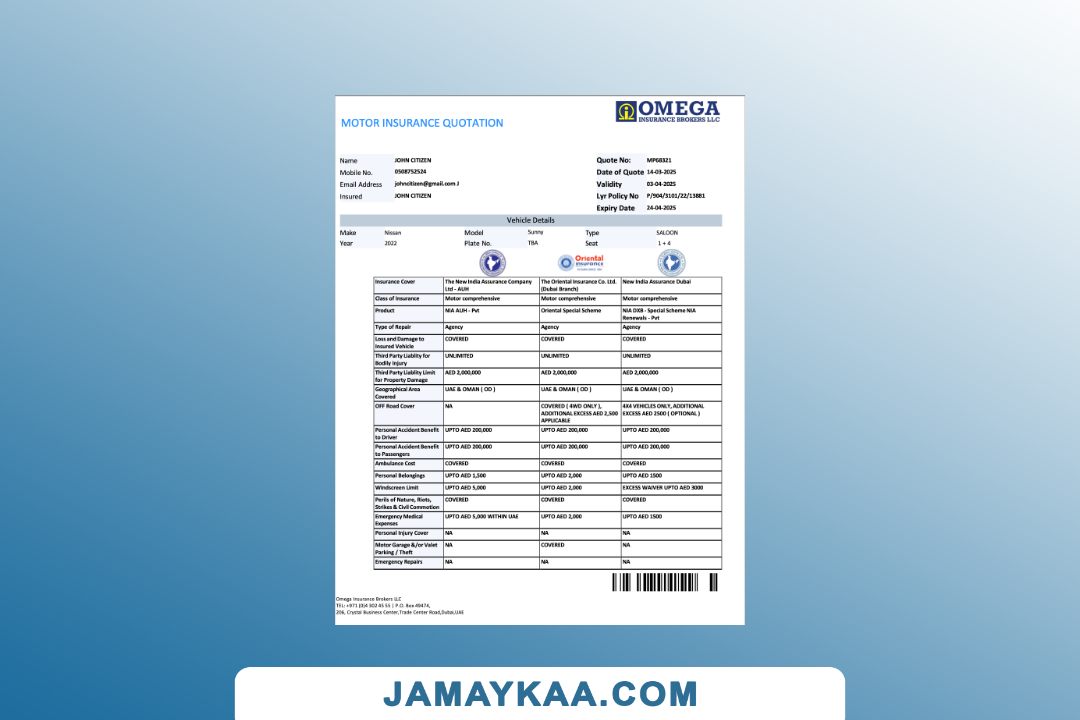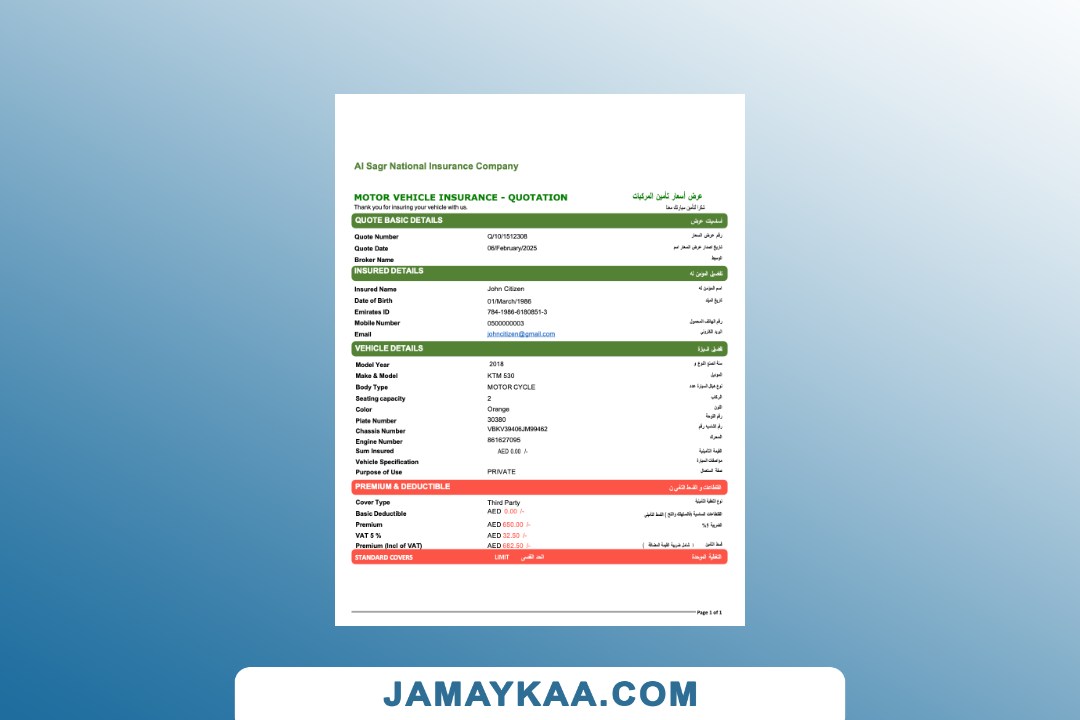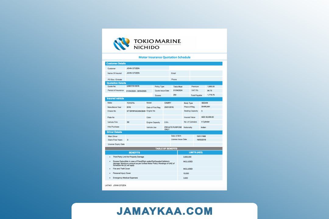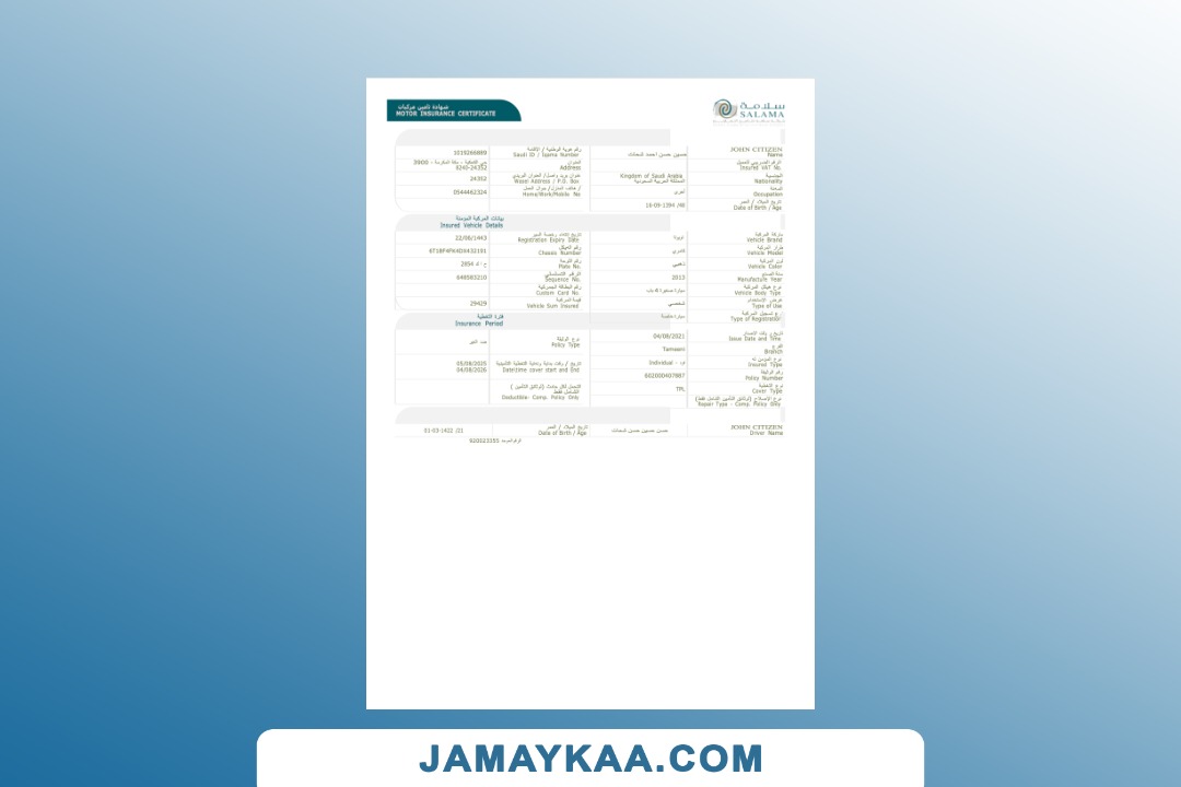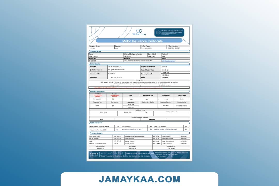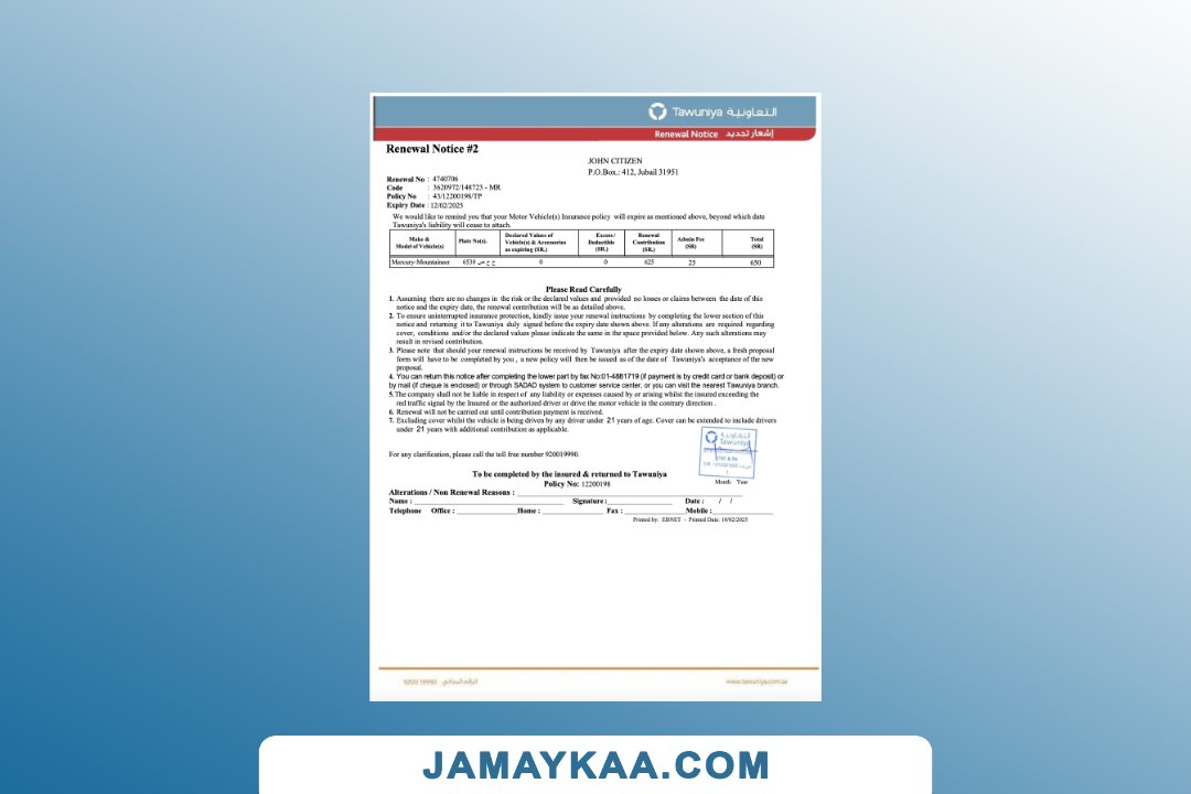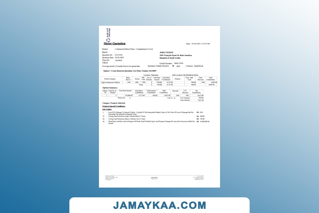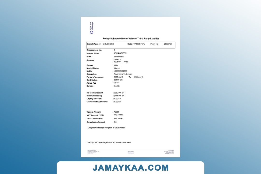 Arabia Tawuniya Insurance policy schedule motor vehicle third party
