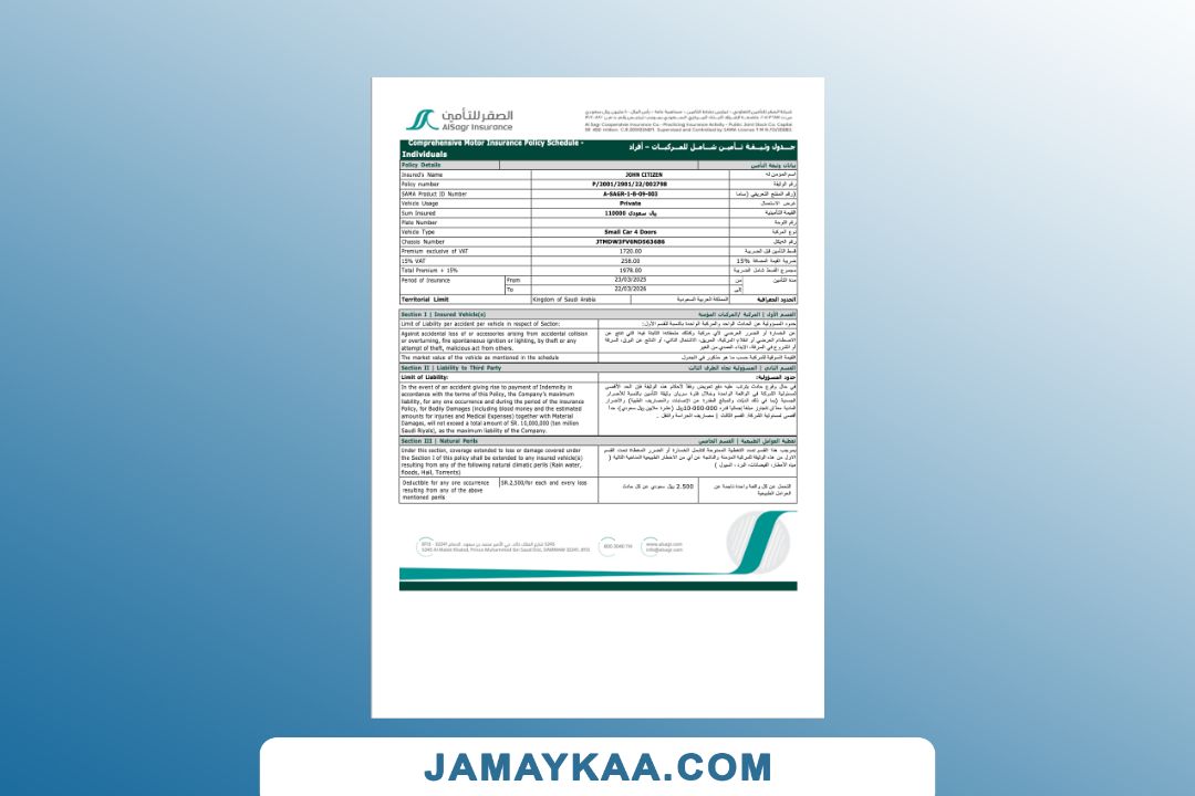 Arabia Wataniya Insurance policy schedule for the comprehensive